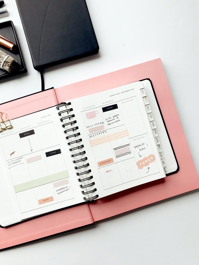Les dernières années, les agendas sans dates ont connu un véritable boom. Ils sont généralement disponibles dans une plus grande variété de mises en page intérieures et certains d'entre eux se rapprochent pratiquement des bullet journals, que nous décrirons plus tard. Leur principal avantage est que vous pouvez commencer à planifier dès le jour où vous l'achetez, sans attendre la nouvelle année. De plus, vous pouvez choisir un agenda qui vous permettra de noter vos habitudes quotidiennes, vous aidera à planifier vos objectifs à long terme ou ajoutera même un journal de gratitude aux fonctions habituelles de l'agenda. L'inconvénient est la nécessité d'inscrire manuellement chaque date et l'absence de calendrier nominatif et de calendrier des jours fériés : vous devrez vous en occuper vous-même.